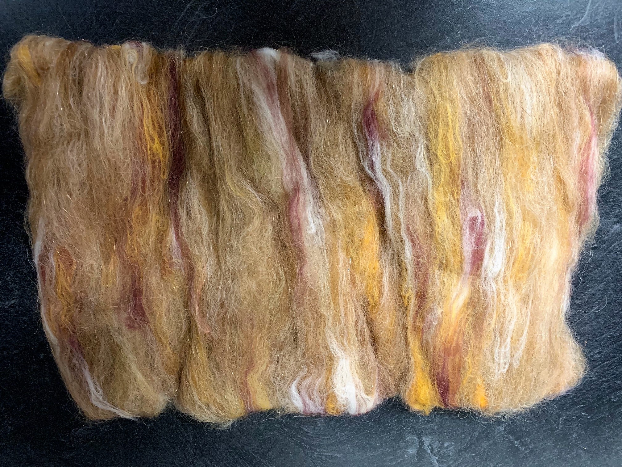 These art batts are so soft and plush! You will truly enjoy hand-spinning or dry/wet-felting these gorgeous alpaca batts. I blend approximately 70% suri & huacaya alpaca with 30% merino wool adding a little sparkle with angelina/firestar and a few suri locks for texture. Just lovely!